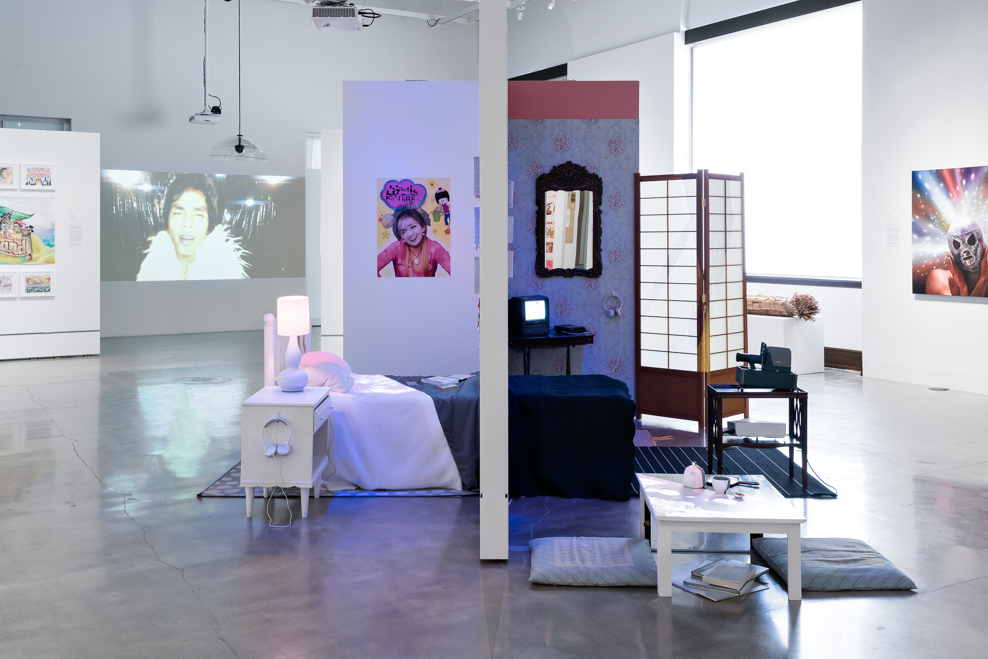 5 channel video sculpture, audio interview, slide projector, ambient light, bedroom furniture, and projection mapped animated video collage on magazine cutout collage